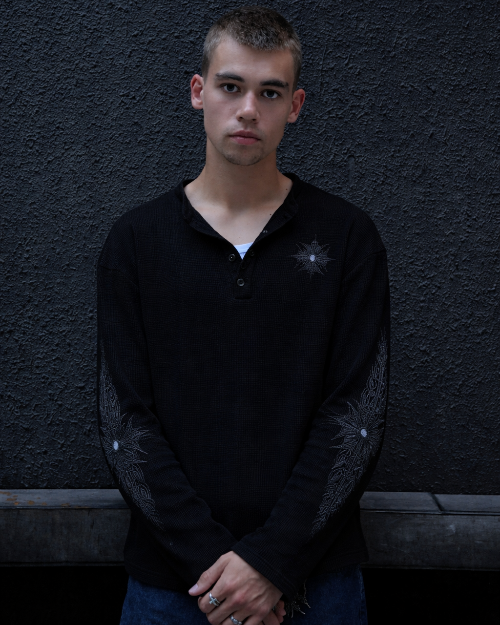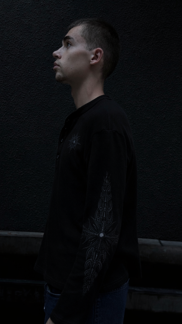 SYMBIOTE BLACK WAFFLE-KNIT HENLEY L/S SHIRT