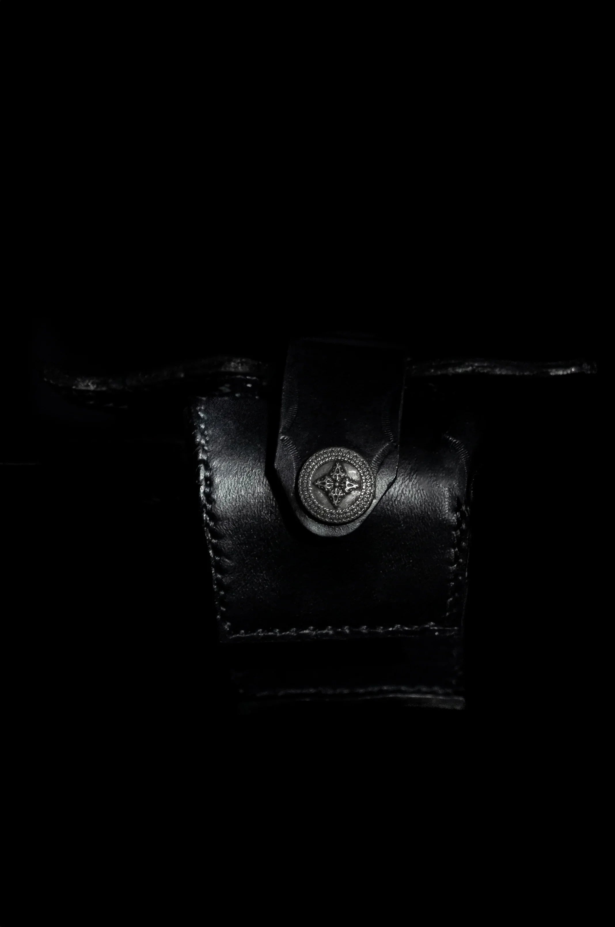 The Shadowguard, This distinctive watch holder is the result of merging ancestral artistry with contemporary functionality. Inspired by the traditional Navajo ketoh (bow guard), each piece is hand-crafted in rich black leather, carefully cut, tooled, and finished by hand. The textured surface is punctuated with four silver rivets and vibrant coral-red leather inlay, balancing cultural reverence with modern utility.